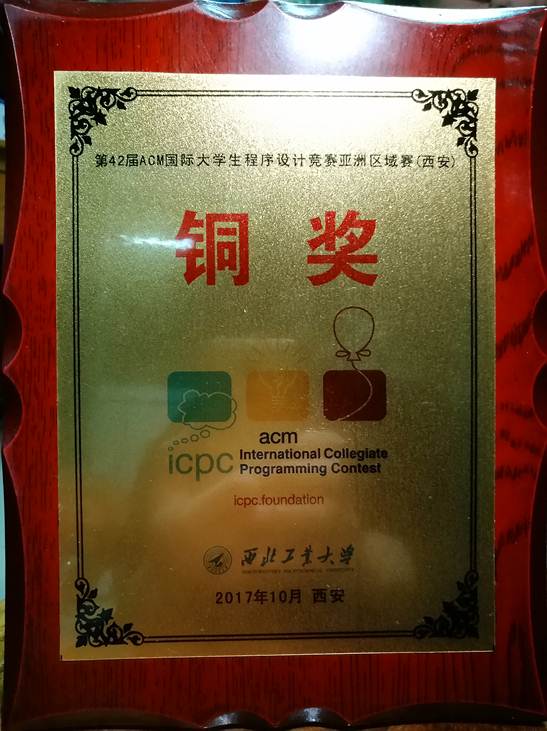 10月28日至29日,第42届ACM国际大学生程序设计竞赛亚洲区域赛(西安站)现场赛在西北工业大学举行,共有来自清华大学、北京大学、复旦大学、武汉大学等近200多所高校的345支队伍入围本次现场赛。经过激烈角逐,我校williamhill英国计科15级学生黄孝伟、任豪杰和计科16级学生张振琦组成的“中工振奇”代表队凭借扎实的专业知识和出色的发挥,漂亮地攻克3题,获得一项铜奖,实现我校ACM集训队在ACM国际竞赛亚洲区域赛获奖的零突破。