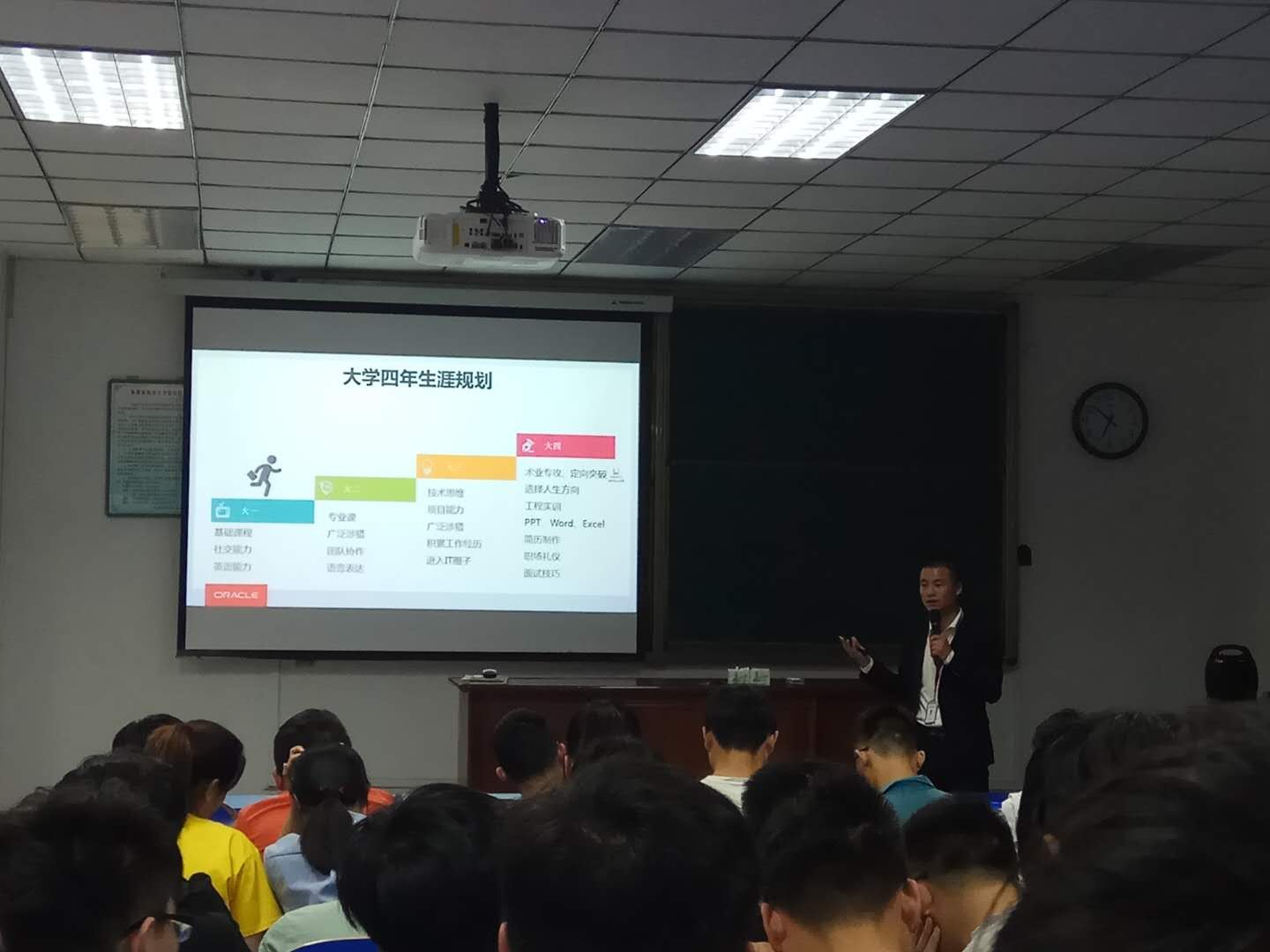吴老师以其亲身IT从业经历、丰富的职业案例,为学生剖析了国内IT就业现状、往届毕业生去向、IT职业生涯规划等内容,并对IT专业常见困惑给予中肯建议和指导。