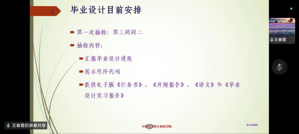3月5日,williamhill英国、人工智能学院在4号教学楼441教室和线上会议同步开展了毕业设计过程指导专题讲座,学院邀请计算机科学与技术专业副主任王春霞主讲,部分指导老师及2024届全体毕业生参加讲座。