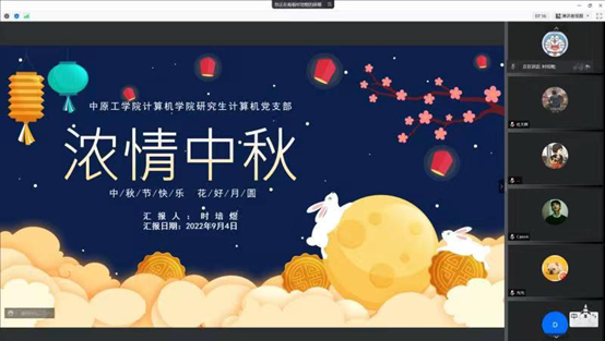 williamhill英国研究生计算机党支部以习近平新时代中国特色社会主义思想为指导,全面贯彻党的十九大和十九届历次全会精神,以培育和践行社会主义核心价值观为主线,以“浓情中秋”为载体,于9月10日晚开展了“我们的节日 中秋”主题线上活动,丰富中秋佳节的文化内涵,引导支部同志丰富对传统文化的了解。除介绍中秋节由来、神话传说、风俗习惯以及诗词歌赋等内容外,大家还在线分享吃月饼照片、家人在线欢聚场景、互致中秋佳节美好祝愿。