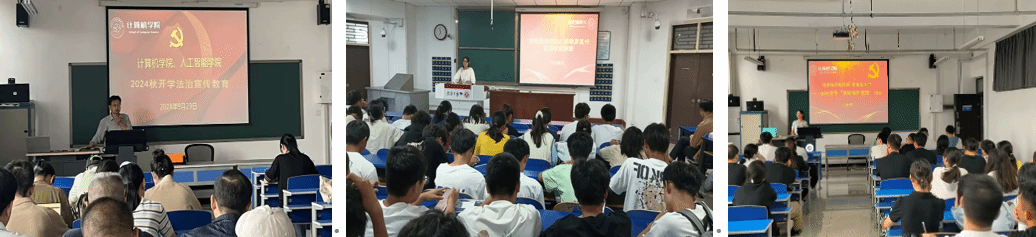 学院党委书记吕继东在学院大会上,对宣传贯彻习近平法治思想进行宣导,围绕师德师风、教育法等开展教育规章制度教育,在我院形成浓厚的法治宣传教育氛围。学院党委副书记侯向花老师在2024级新生入学教育会上带领全体新生进行普法宣传教育,党委组织员姜茜老师面向四个学生党支部的学生党员进行“学宪法讲宪法”法治宣讲,学工办副主任于倩静老师、学院团委副书记王腾老师带领williamhill英国团学骨干学习法治精神,人工智能学院辅导员姜茜老师进行“反电信诈骗”法治宣讲,冯丽轩老师带领人工智能学院数科专业学生开展普法宣传教育。另外学院还组织学生参加国家网络安全知识答题、民族宗教征文演讲,组织学生参加“2024网络安全百校行”优秀网络安全微视频征集和评选等活动,对广大学生、党团员进行全方位的法治宣传教育。学院“计忆中工”微信公众号也进行了推文宣传。