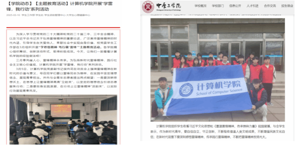 3月10日、11日计算机学院将开展的“学雷锋,我行动”系列活动新闻稿通过学校学工平台及学院官网进行发布,详细介绍学院开展学雷锋主题教育活动以来取得的成果,学生们深刻感受到了雷锋精神的力量,激发广大学坚定理想信念,涵养高尚品德,践行雷锋精神的热情和信心。