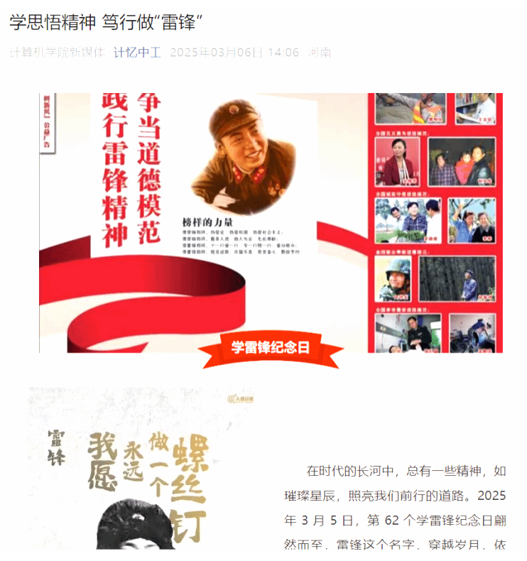 3月6日,学院利用“计忆中工”微信公众号平台,发布了以“学思悟精神 笃行做‘雷锋’”为主题的推文。推文通过图文并茂的形式,阐述了雷锋精神的时代内涵,号召广大学生向雷锋同志学习,积极参与志愿服务活动。