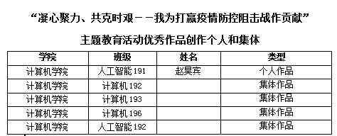 根据我校下发的《关于开展“凝心聚力、共克时艰--我为打赢疫情防控阻击战作贡献”线上主题教育活动的通知》要求,学院对各班级推荐的作品进行评选,最终确定以下优秀作品刊登至学院微信公众平台,现对优秀作品的创作同学和集体予以表彰,详见附件。
