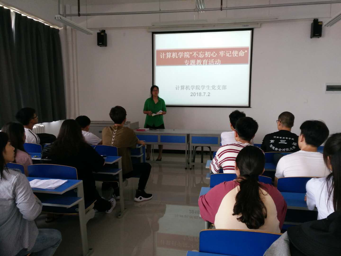 会上,侯向花老师首先宣读和传达了校党委下发的《中共河南省委组织部关于在“七一”期间认真组织开展以“不忘初心、牢记使命”为主题的支部党日活动的通知》,提出了本次我院学生党支部活动的主题——不忘初心,牢记使命,助力学风建设,做新时代合格党员。