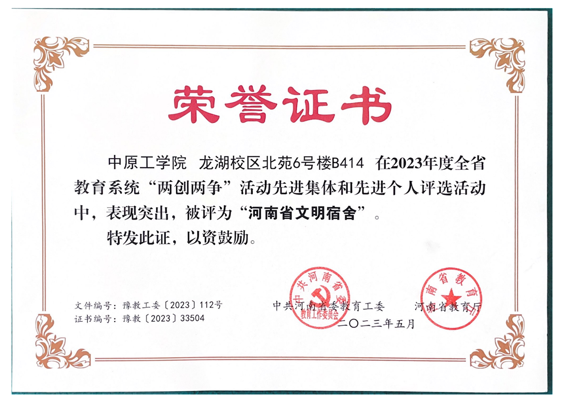 近日,中共河南省委教育工委、河南省教育厅公布2023年度全省教育系统“两创两争”活动先进集体和先进个人评选结果,williamhill英国北苑6号楼B414 宿舍在评选活动中,表现突出,被评为“河南省文明宿舍”。