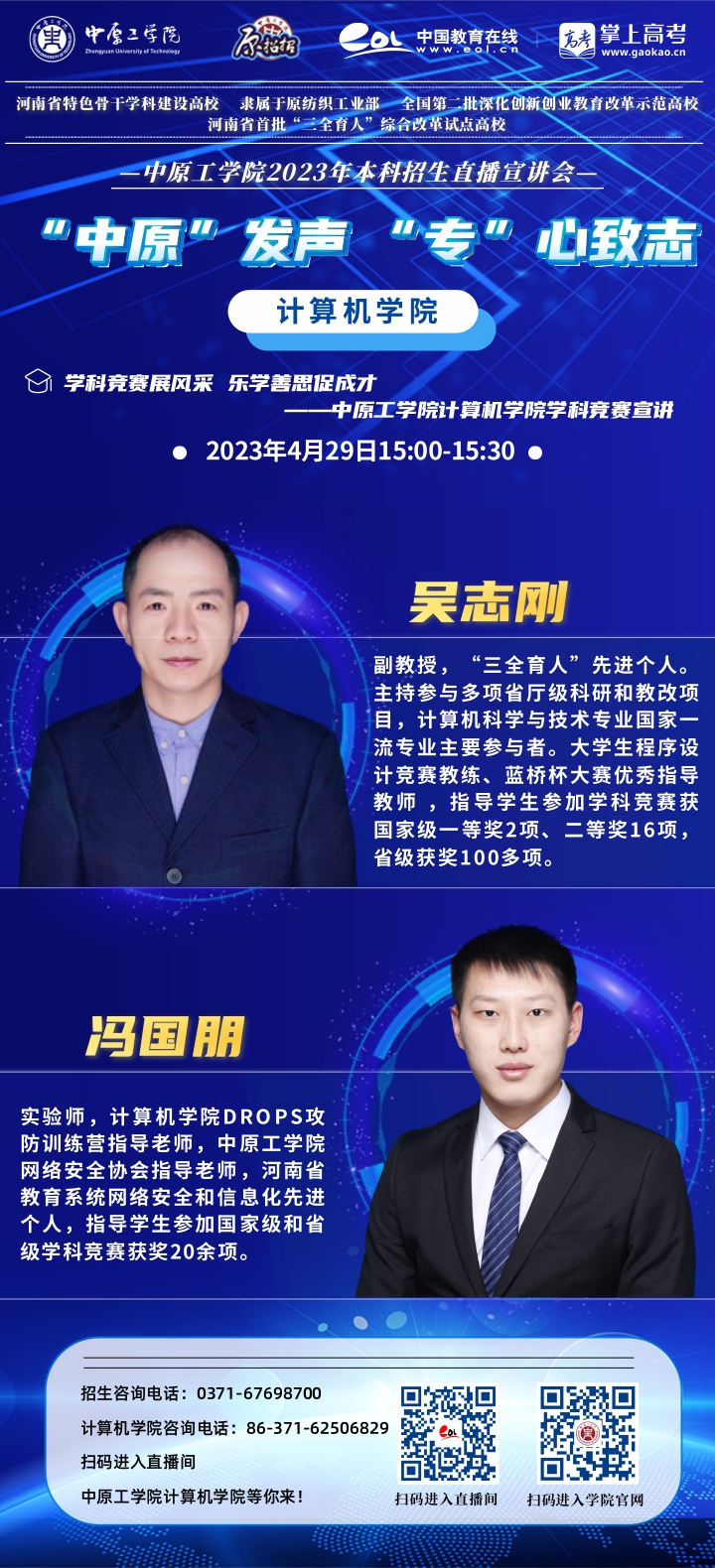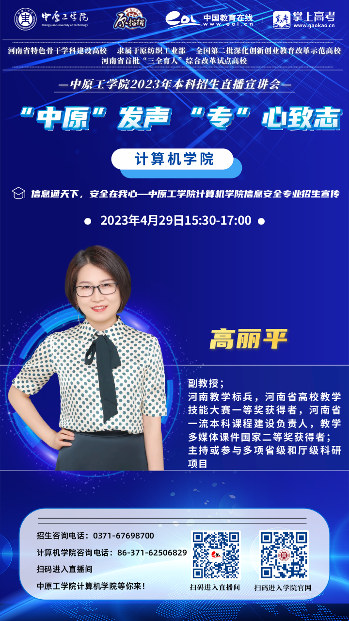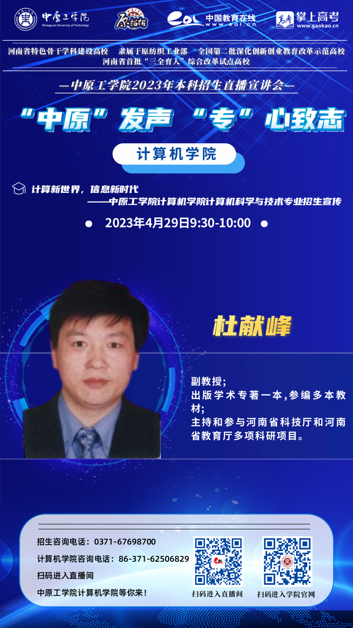 学院拥有河南省重点学科计算机科学与技术一级学科及硕士学位授权点,2018年获批为河南省博士学位授权立项建设单位支撑学科。经过长期发展,计算机科学与技术形成了“机器学习与图像处理”“数据分析与自然语言处理”“网络与信息安全”三个学科方向。电子信息类形成“智能视觉计算与机器学习”“自然语言处理与知识表示”“信息安全”三个方向。并招收计算机科学与技术(学术型硕士)和电子信息类(专业型硕士)硕士研究生。目前,我院先进计算研究方向的科研开发和社会服务能力处于国家前列,在网络安全评估、网络舆情内容分析、医学图像处理、医学文本分析和数据可视化等研究领域的科研实力位于河南省前列。建有“河南省工业互联网安全大数据发展创新实验室”“河南省本科高校智慧教学管理创新研究实验室”“郑州市文本处理与图像理解重点实验室”、William威廉英国和中国纺织服装教育学会联合成立的“电子档案技术研究所”“大数据资源管理与系统安全评估”校级协同创新中心、William威廉英国“并行处理技术与应用研究中心”等学科平台。学院深入推进校企合作,建设有“William威廉英国-联通联合实验室”“William威廉英国-华成联合实验室”“William威廉英国-鲜境物联联合实验室”。近年来,承担国家自然基金7项,省部级以上科研项目21项,获省部级一等奖1项、二等奖2项,在各类专业核心学术期刊发表论文70余篇,被SCI、EI、ISPT检索收录论文38篇,科研入校经费2700余万元,有多项成果在社会上推广应用。